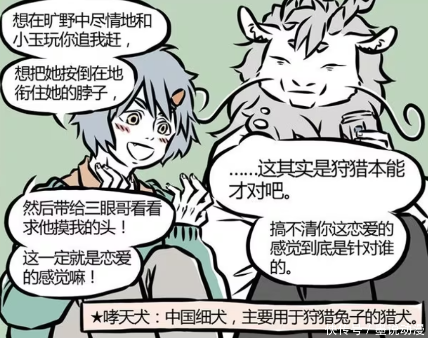 不过聊下去之后,哮天表示喜欢在狂野中跟小玉你追我赶,还想把她按倒在地上甚至衔住脖子。哮天这么做的目的,就是想将小玉带到杨戬面前,让他夸自己。对于哮天来说,这就是恋爱的感觉。可是敖烈听完之后,才发现这哪是什么恋爱感觉,也谈不上喜欢,而是来自狩猎本能。哮天连恋爱的感觉都没有搞清楚,就追了小玉这么久。另外哮天是中国细犬,主要是用来狩猎兔子的猎犬,所以才会对小玉有这么特殊的感觉。