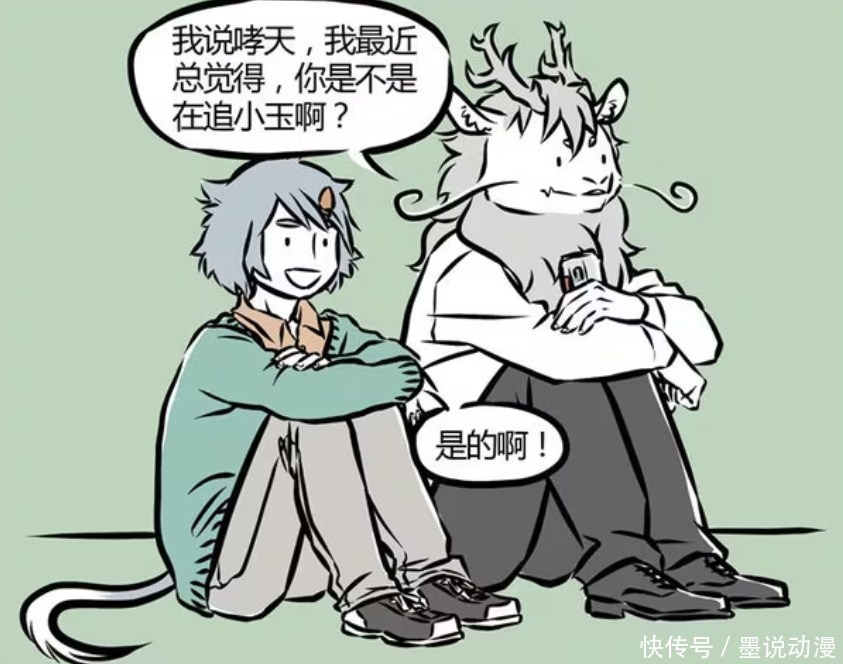 《非人哉》漫画版中,哮天看起来是很喜欢小玉,不管是哪个时期,哮天都能表现出对小玉满满的喜欢。小玉平时对哮天也还算不错,在他耳朵受伤的时候会给他包扎。在敖烈和哮天聊起这段所谓的恋情之后,敖烈才发现,哮天或许不一定喜欢小玉,而是来自细犬的狩猎本能。